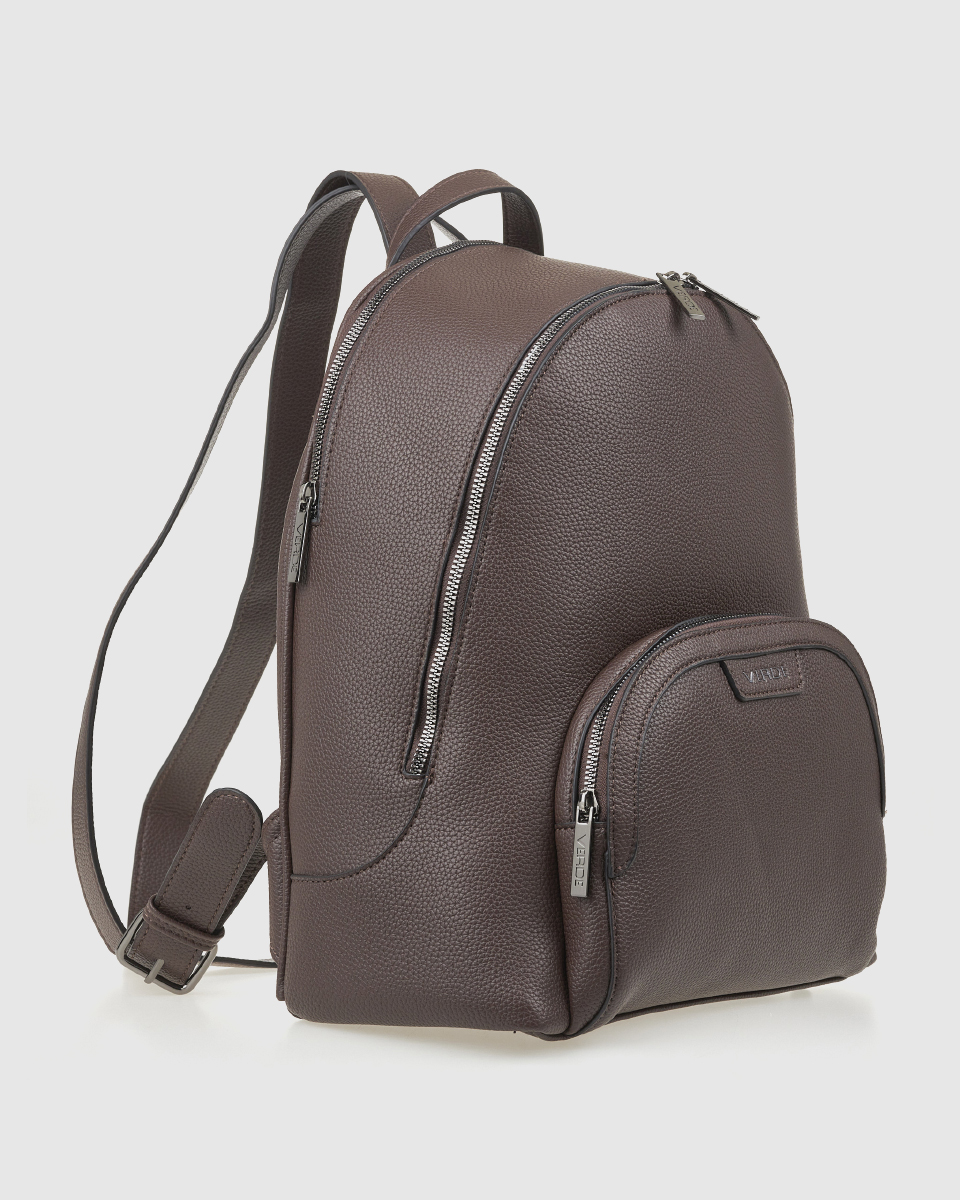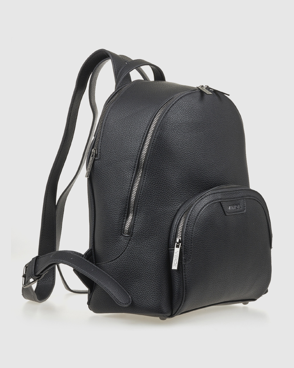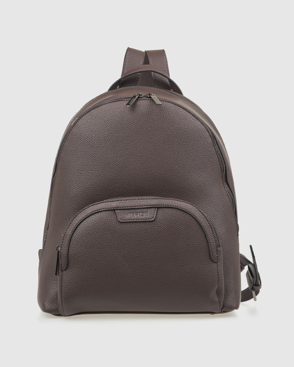 Women’s Verde backpack with a basic zipper closure and a spacious outer zippered front compartment, various internal compartments for a mobile phone case and an inside zippered pocket.