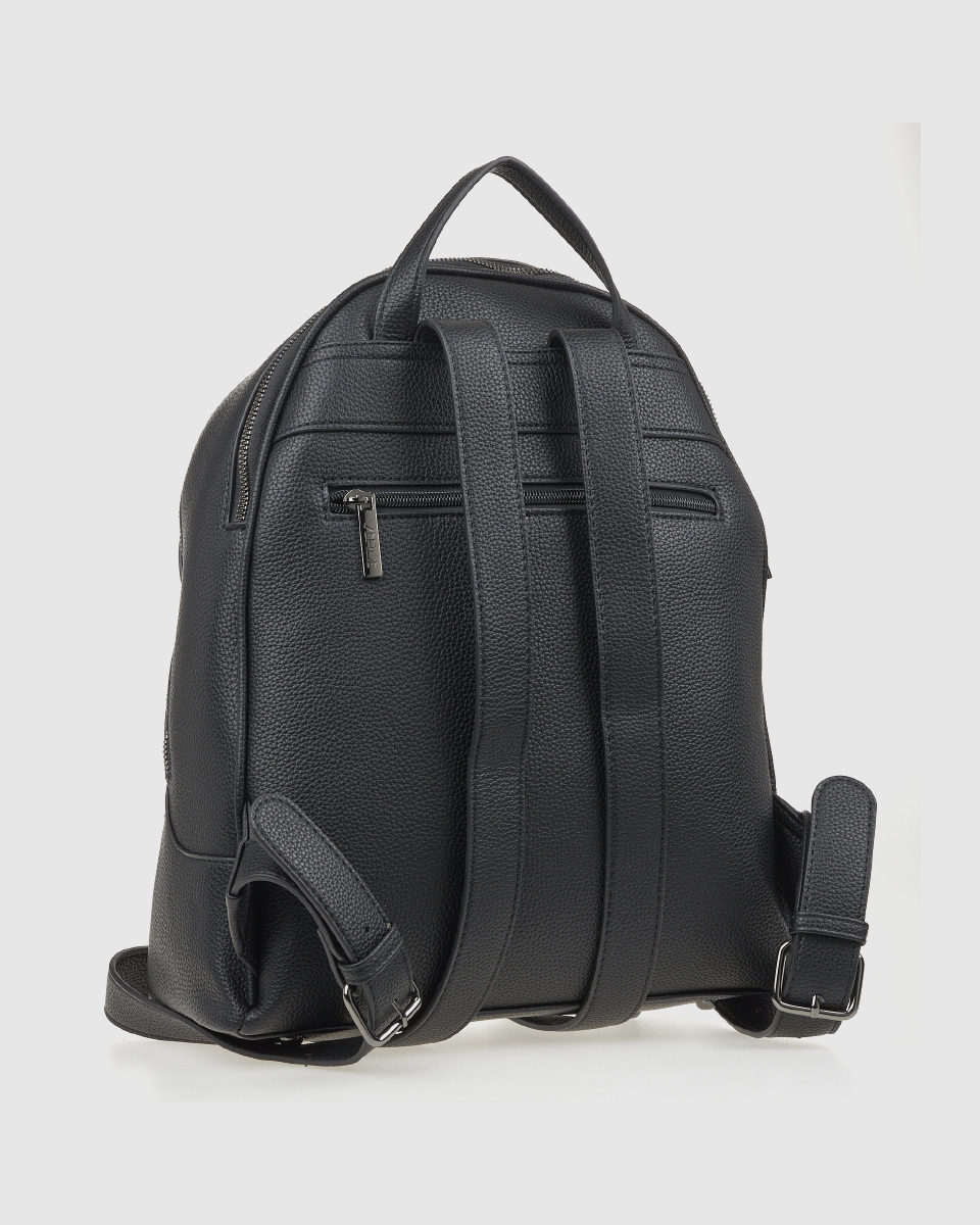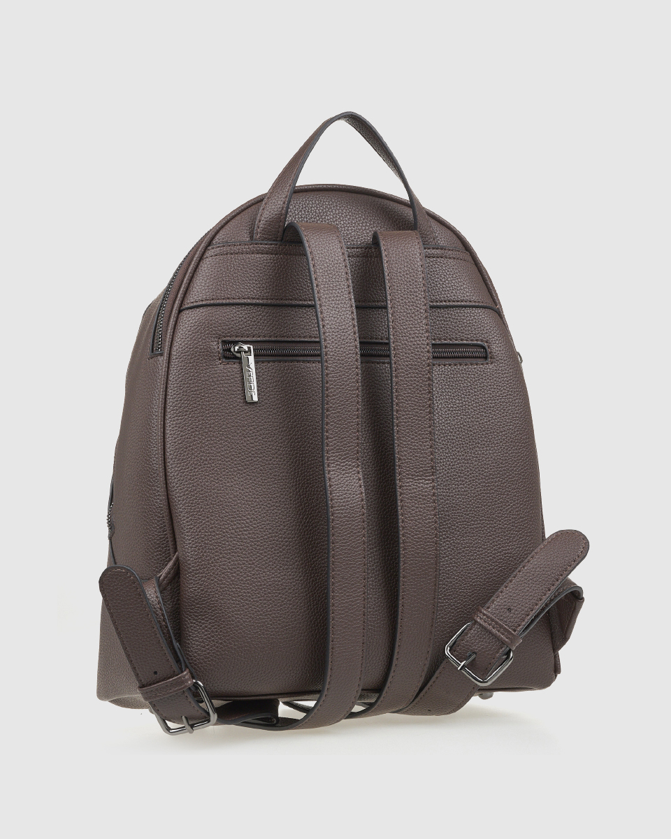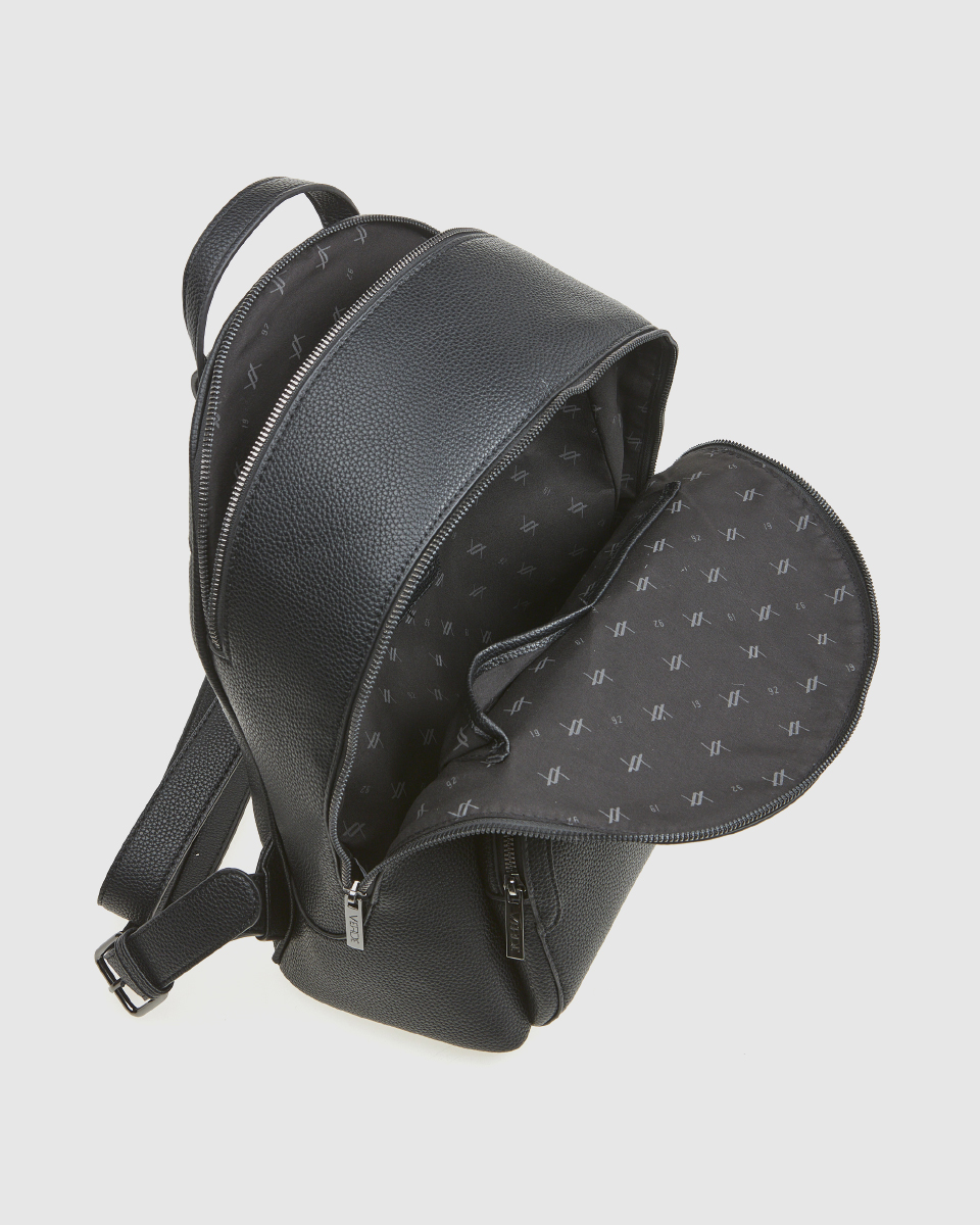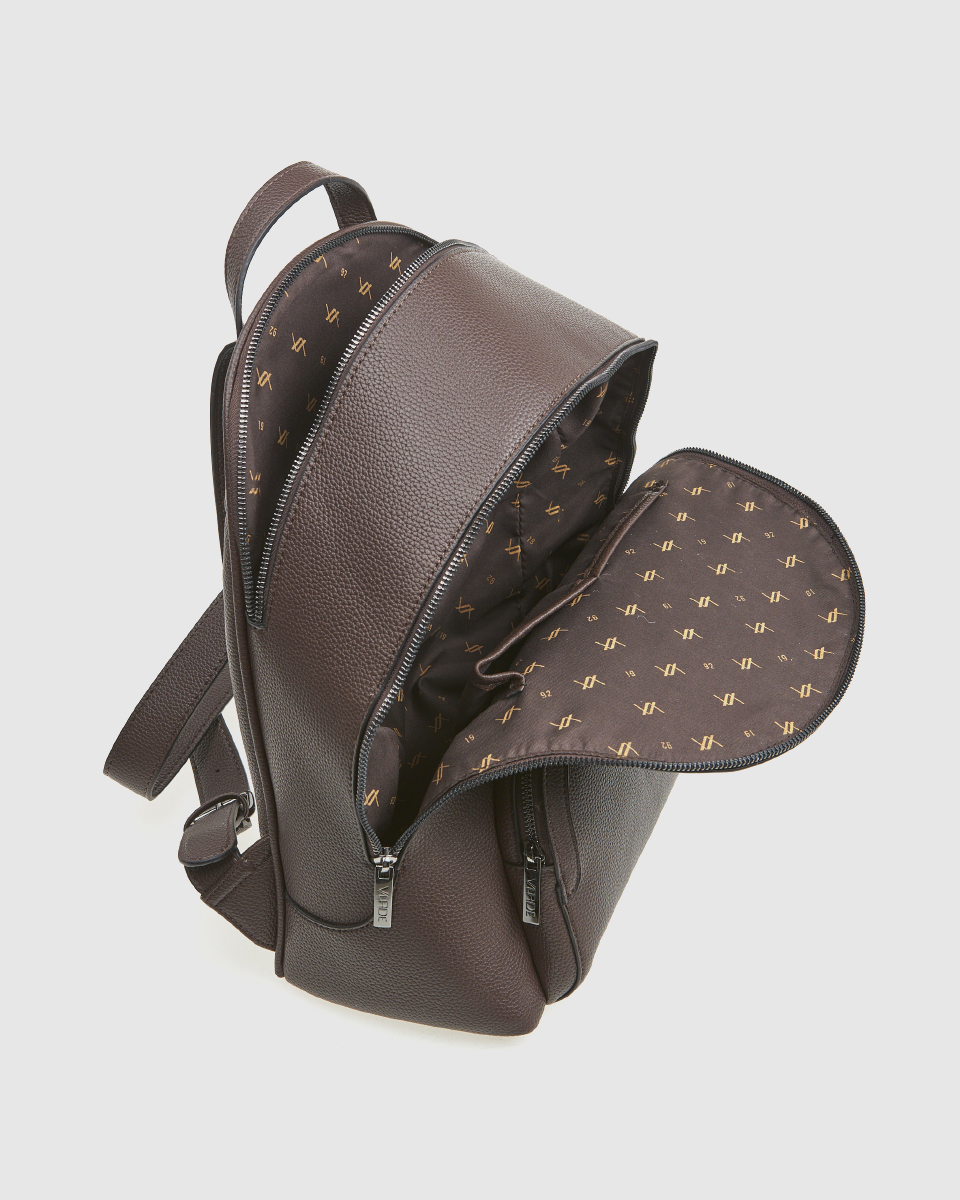 Women’s Verde backpack with a basic zipper closure and a spacious outer zippered front compartment, various internal compartments for a mobile phone case and an inside zippered pocket.