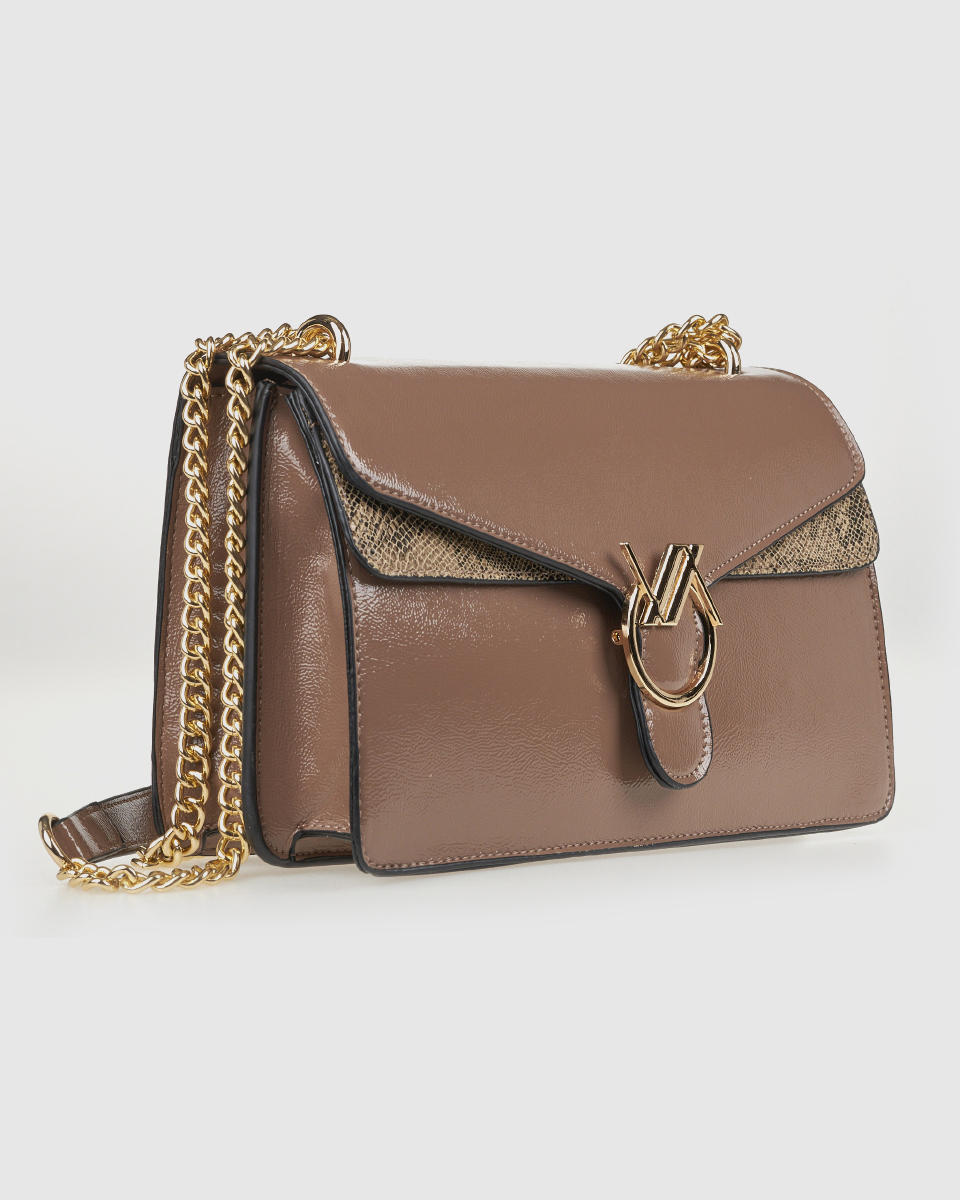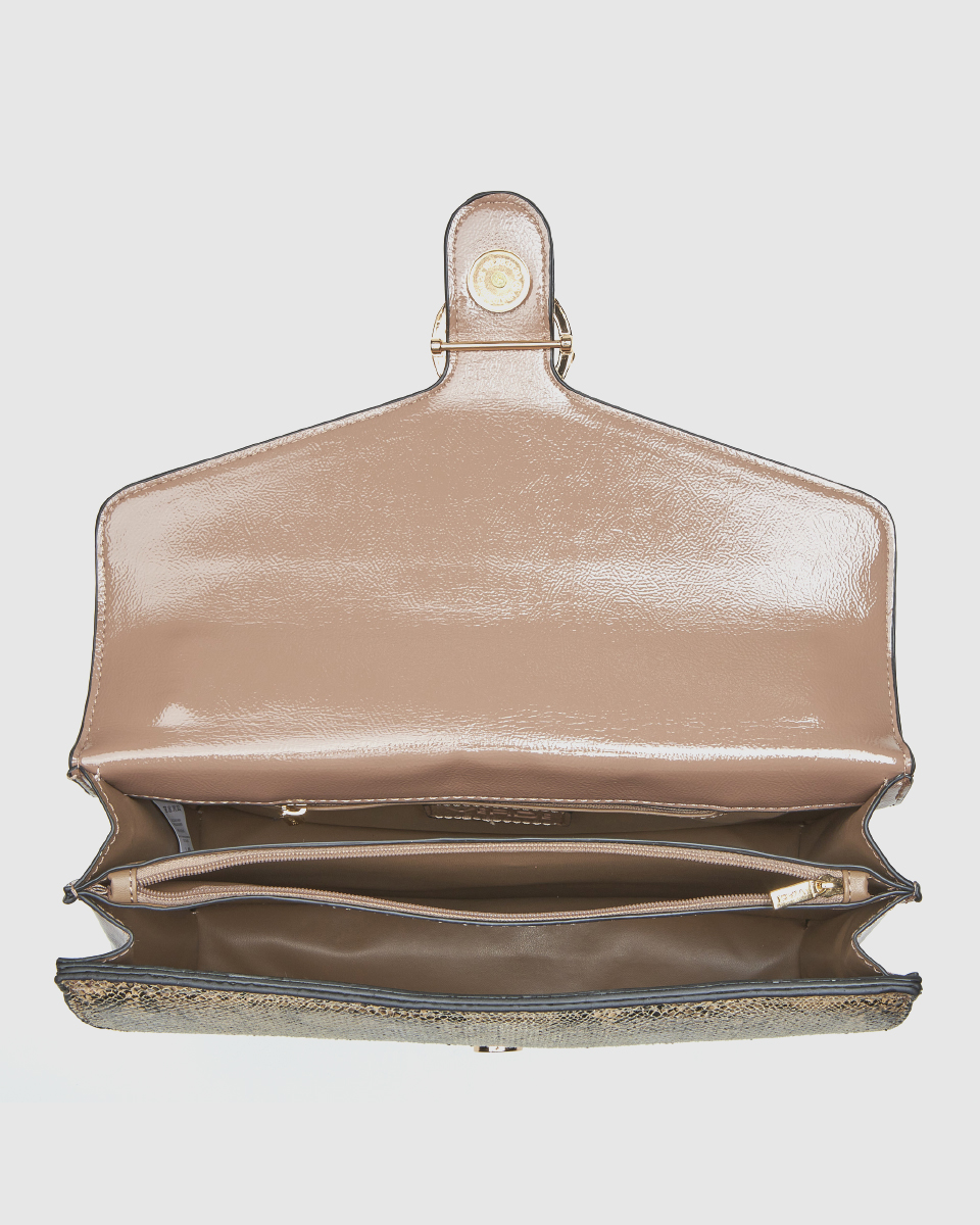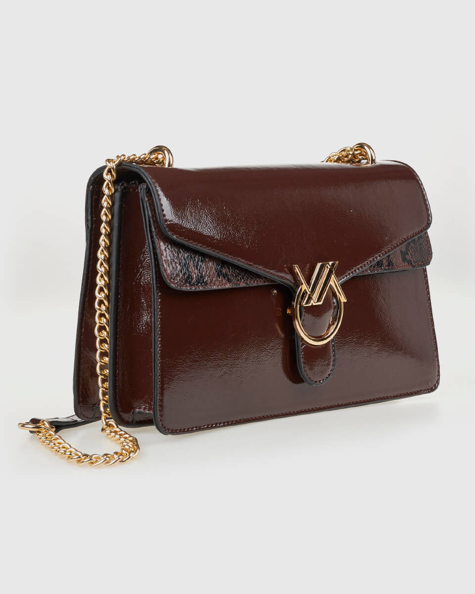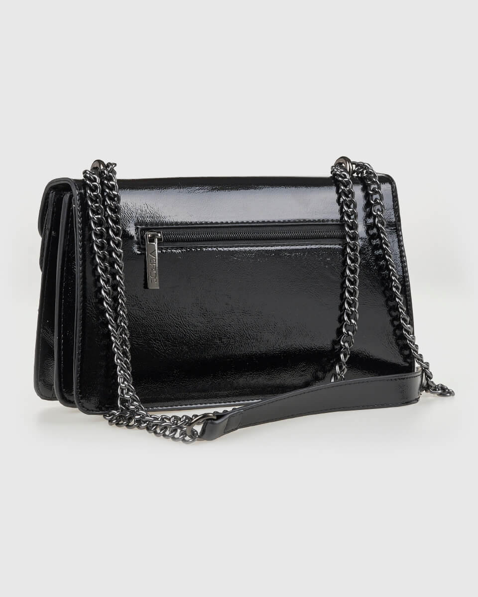 Γυναικείο τσαντάκι χιαστί Verde με μία κύρια θέση που κλείνει με περιστρεφόμενο μεταλλικό κούμπωμα δύο εσωτερικές βοηθητικές θήκες αποσπώμενο λουράκι στήριξης
