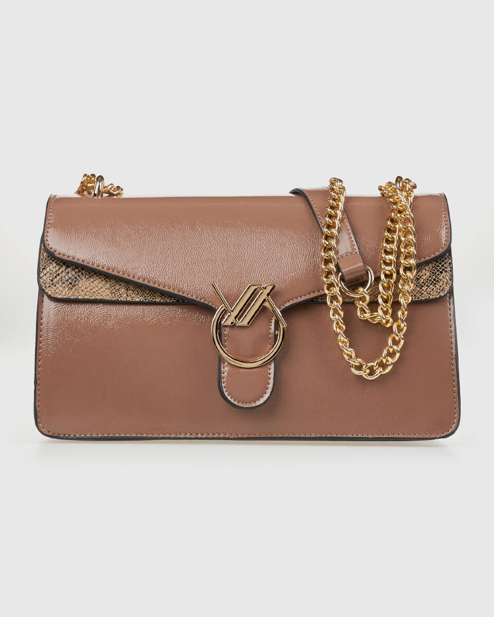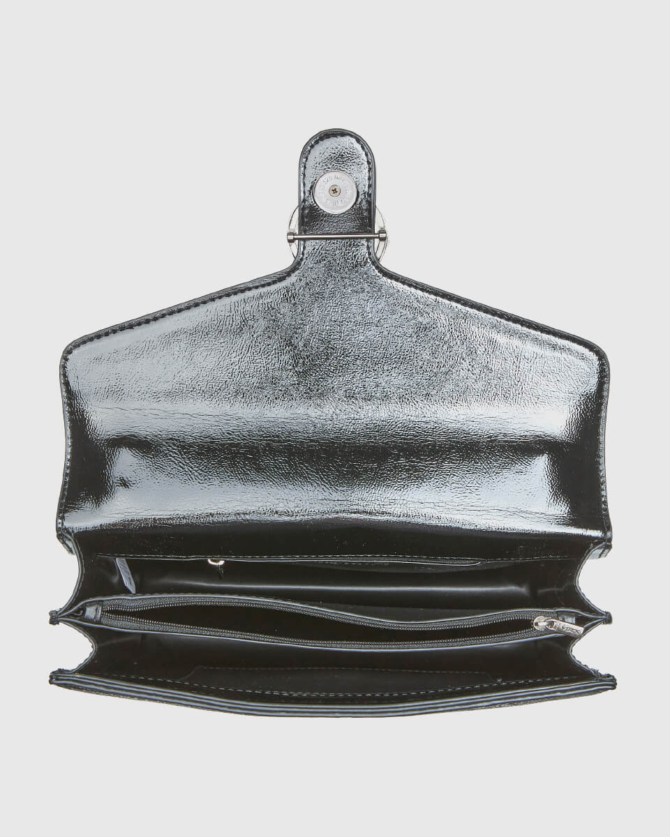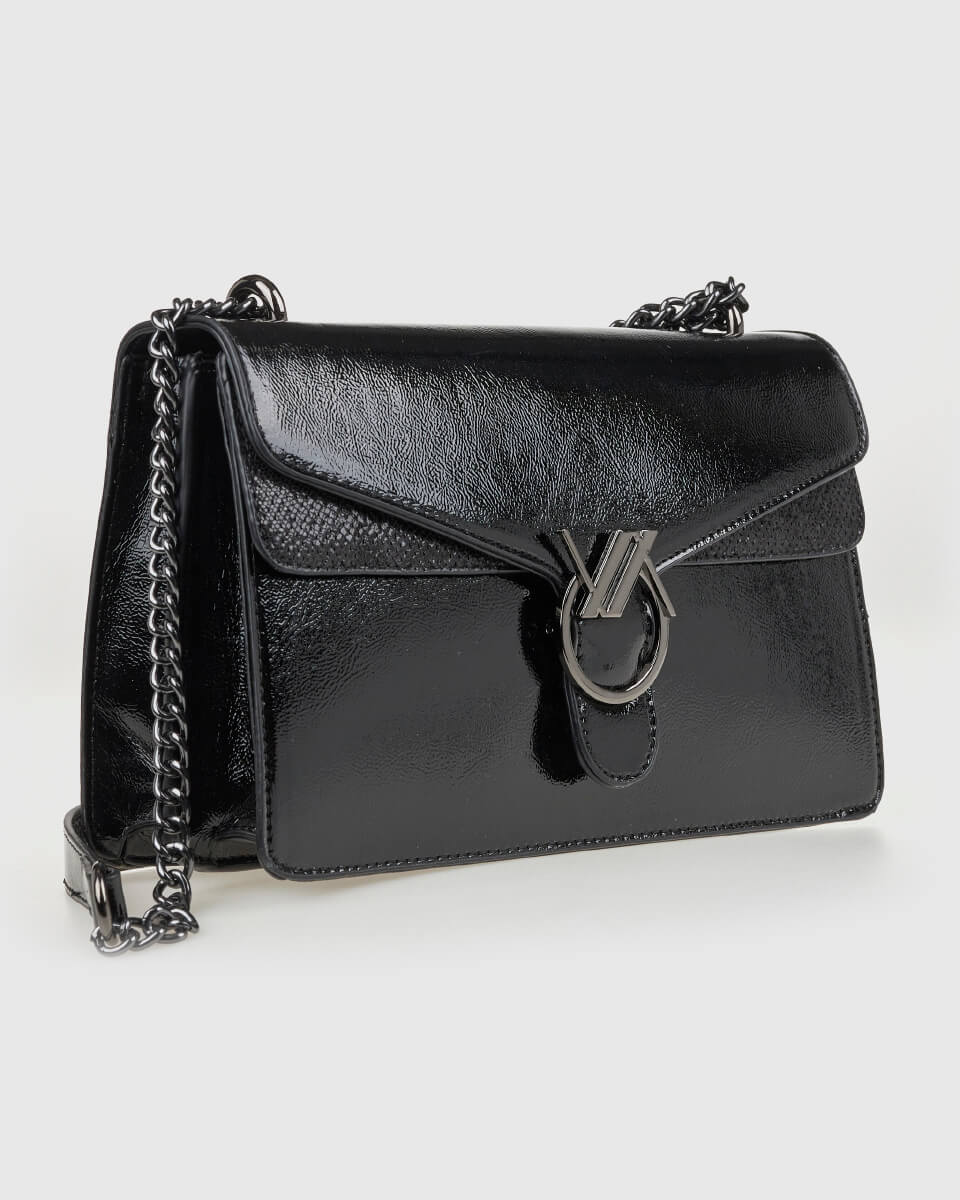 Γυναικείο τσαντάκι χιαστί Verde με μία κύρια θέση που κλείνει με περιστρεφόμενο μεταλλικό κούμπωμα δύο εσωτερικές βοηθητικές θήκες αποσπώμενο λουράκι στήριξης